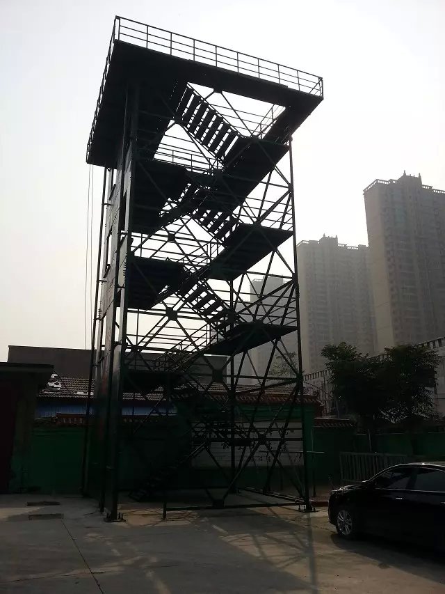 六、訓練塔宜設置室外消防梯。消防梯應通至塔頂,并宜離地面 3 米高處設起,寬度不宜小于50厘米。訓練塔說明:1,主要由(1)模擬窗、(2)樓層隔板、(3)后骨架、(4)了望、指揮平臺骨架及主體鋼結構框架等組成。在塔體前端部位設有模擬窗(根據(jù)需要定做幾層幾窗口),在上、下相鄰的模擬窗之間設有樓層隔板(鋼板)。2,在塔體后部下方設有與模擬窗相對應的后骨架。3,模擬窗與樓層隔板以及后骨架及主體框架相互之間用螺栓連接為一體。4,層與層之間均有安全樓梯連接。5,塔體上部裝有了望、指揮平臺�!�
