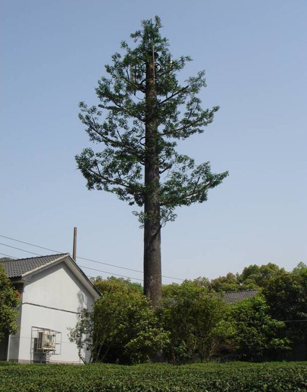 優(yōu)點:保持了原有單管塔的所有優(yōu)點,在其外形上作了重大的突破、改進,以自然生長的松樹,樟樹等為仿真的造型樣本,設(shè)計素描圖和電腦效果圖,制訂雕塑和噴涂工藝程序,對單管塔仿真?zhèn)窝b,使人們察覺不到塔的存在,把它融入了周圍的自然環(huán)境中。