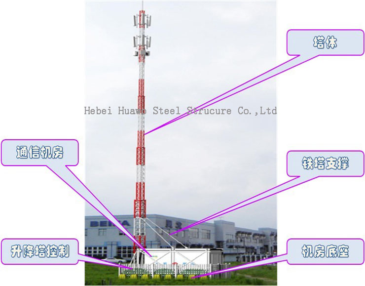 4.Anti-wind capability:Apply to wind pressure region under 0.9Kpa without guy wire.Meet more than 98% of domestic region.Special steel material and clever structure design to ensure the tower body mechanics perfomances..It can resist 12 grade typhoons.In coastal areas it can resist 18grage gust.
